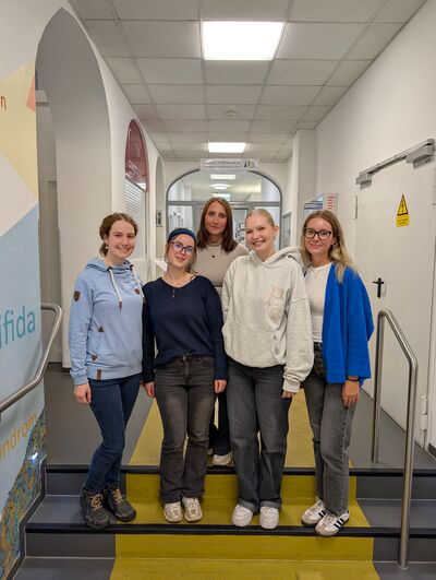 Die ersten vier Studentinnen, die im Jahr 2025 über die Landzahnarztquote zum Zahnmedizinstudium an der Uni Halle zugelassen wurden. V. l.: Yasmin Barthel, Pia Sabrina Walther, Anja Stöber (KZV), Paula Demmer und Yara-Marie Lipinski.